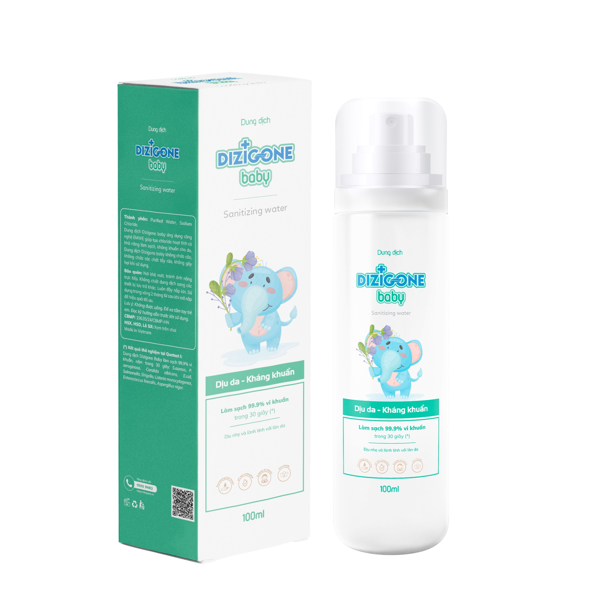 Dung dịch DIZIGONE Baby (chai xịt 100ml) ứng dụng công nghệ EMWE giúp tạo ra sản phẩm chloride hoạt tính có khả năng làm sạch 99.9% vi khuẩn, nấm trong 30 giây. Sản phẩm được chứng nhận hiệu quả kháng khuẩn tại Quatest 1.